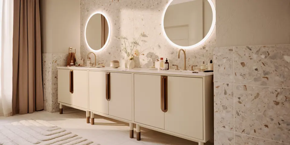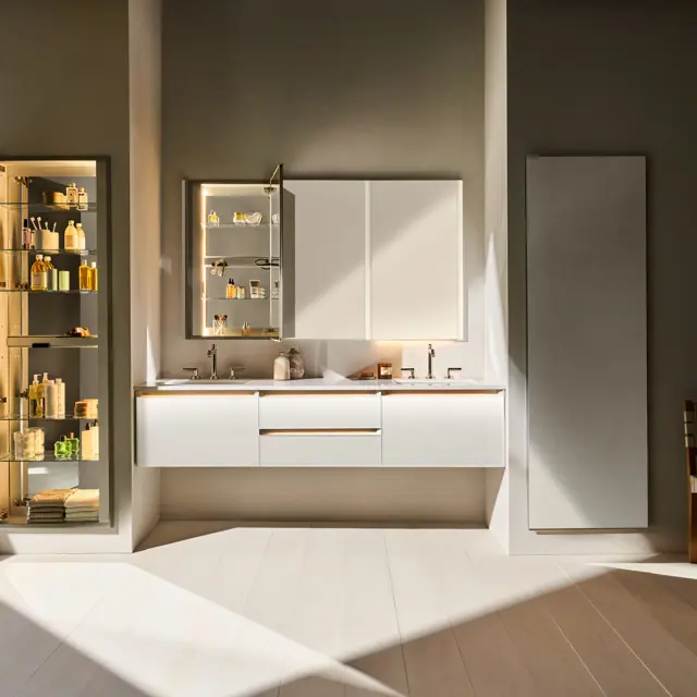 Complements Craft Series vanities and linen cabinets.