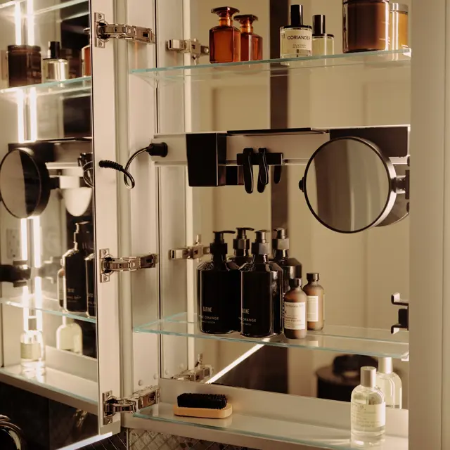 Upgrade your cabinet with accessory trays that store your essentials out of sight, but within easy reach.