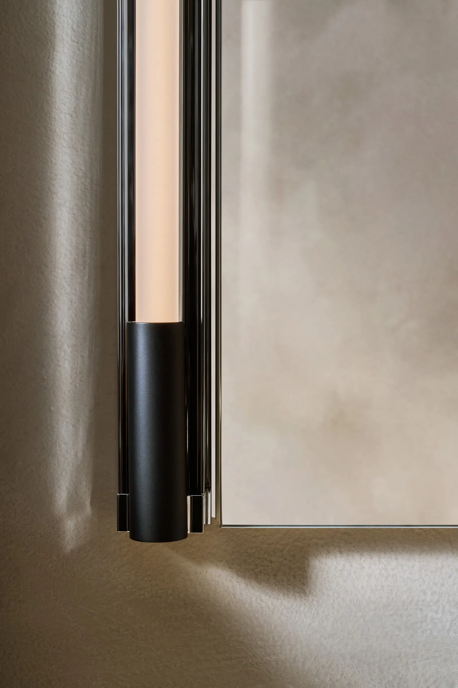 Mirrored frame with center light sits perfectly flush.