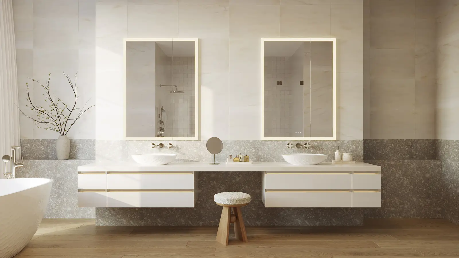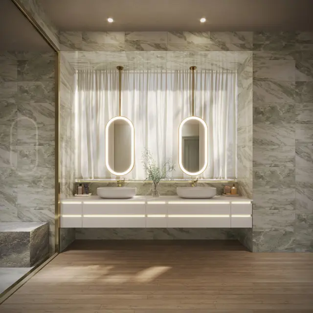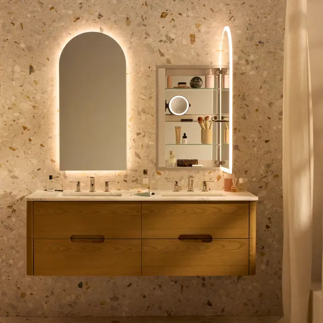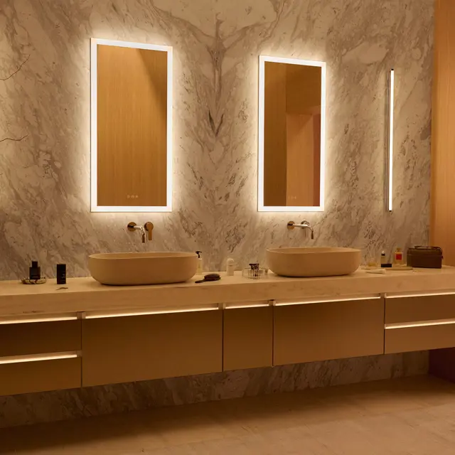 Choose your best light: Reimagine the Statuesque lighted mirror in your own inimitable style — and size. Design a custom-sized lighted mirror for any space or room environment.