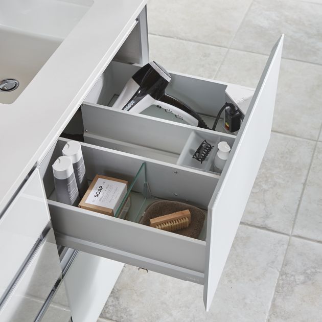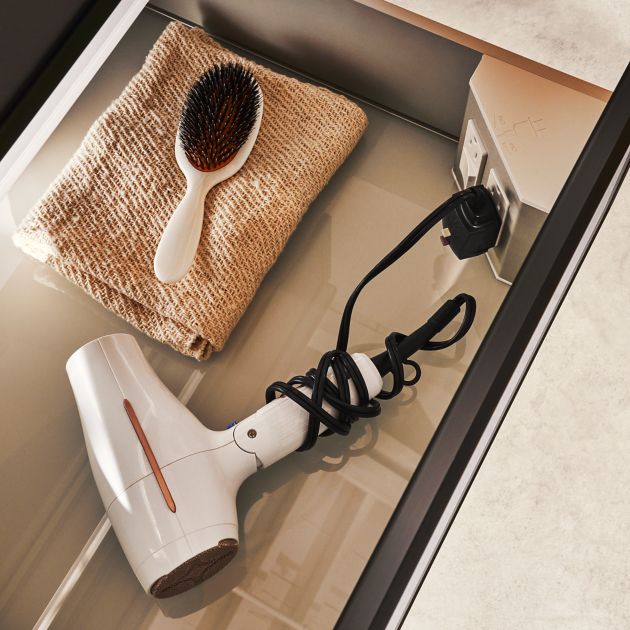 - With the glass and aluminum construction of the drawers, when done with a hair dryer or curling iron, no need to unplug and you can put directly into the drawer and know it will not burn or leave heat marks.