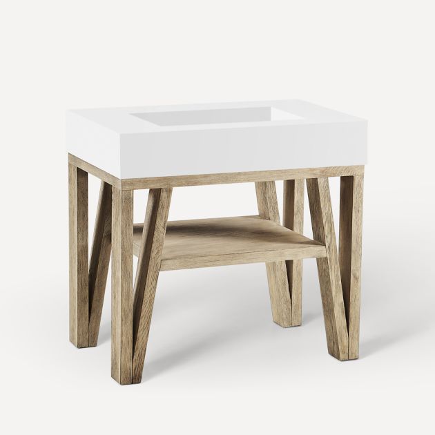 - Taking a cue from the exposed beams in a modern farmhouse, architectural details and an open console design with integrated basin sink bring earthy, artisanal style into your space.