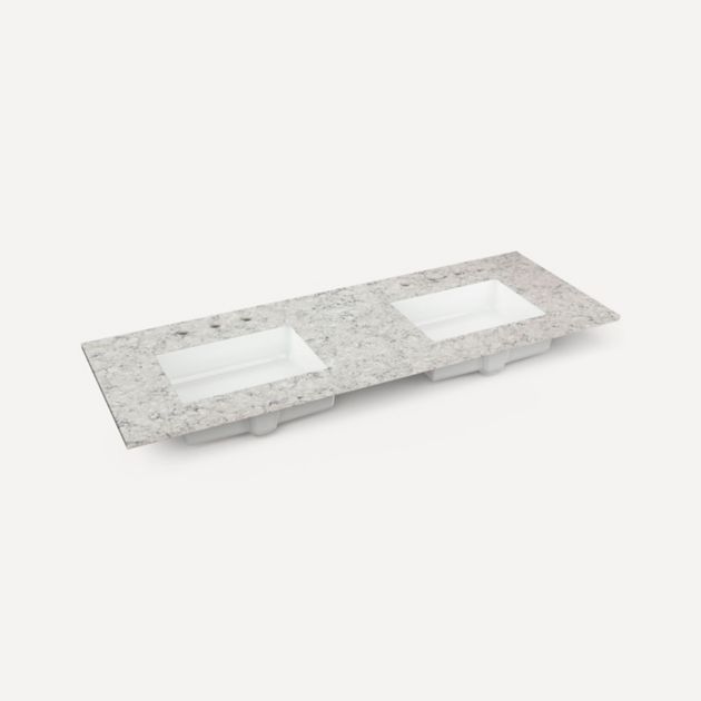 - Our quartz stone tops feature a white rectangular sink, with overflow, in an 1-1/8" thickness and mineral cast integrated sink with removable drain cover in 6" thickness.