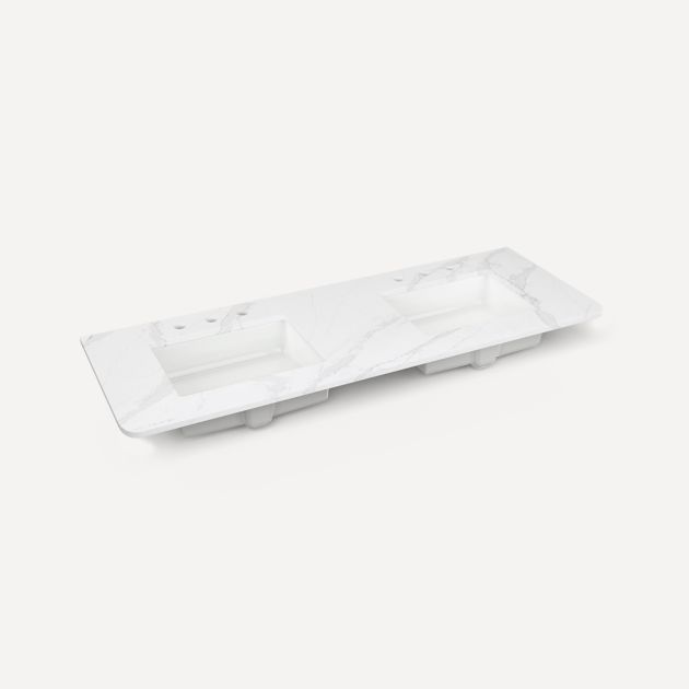 - Our quartz stone tops feature a white rectangular sink, with overflow, in an 1-1/8" thickness and mineral cast integrated sink with removable drain cover in 6" thickness.