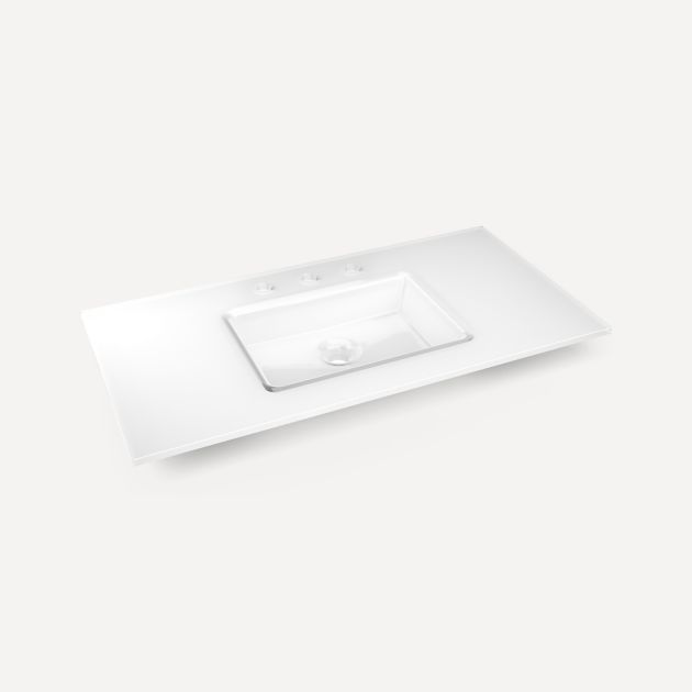 - Combine quality and clarity for a pure, polished finish. Our low-iron glass virtually eliminates the greenish cast commonly found in thick glass, allowing for cleaner, brighter white tones. Glass vanity tops can be configured with an integrated sink bowl to create a seamless look in your styling space.