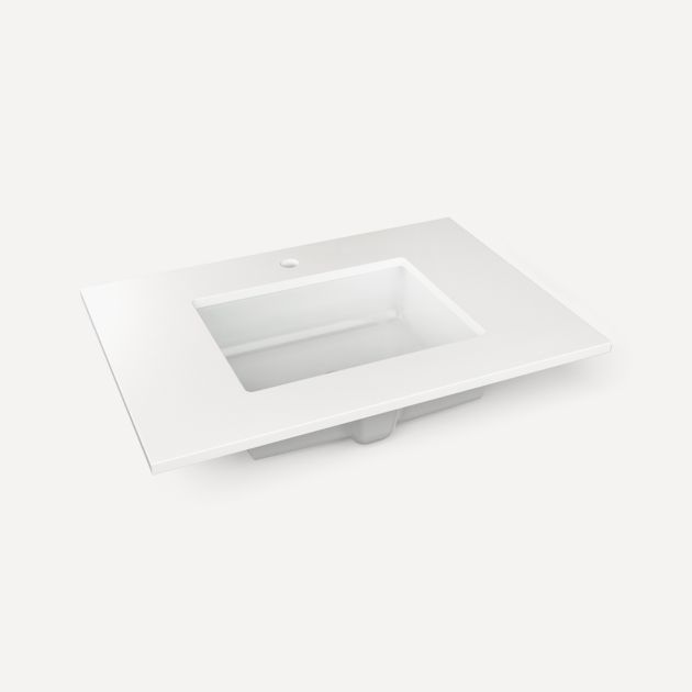 • Our stunning glass top features a rectangular integrated sink, without overflow, in a 19/32" thickness. Our quartz stone tops feature a white rectangular sink, with overflow, in a 3/4" thickness.