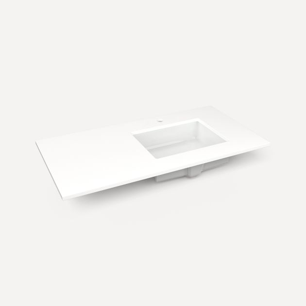 - Our stunning glass top features a rectangular integrated sink, without overflow, in a 19/32" thickness. Our quartz stone tops feature a white rectangular sink, with overflow, in a 3/4" thickness.