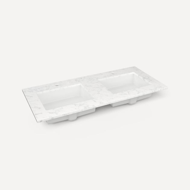 - Our stunning glass top features a rectangular integrated sink, without overflow, in a 19/32" thickness. Our quartz stone tops feature a white rectangular sink, with overflow, in a 3/4" thickness.