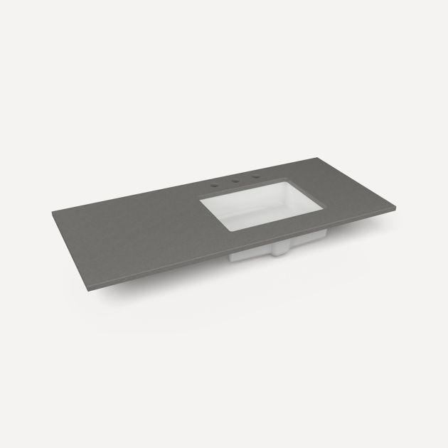 • Our stunning glass top features a rectangular integrated sink, without overflow, in a 19/32" thickness. Our quartz stone tops feature a white rectangular sink, with overflow, in a 3/4" thickness.