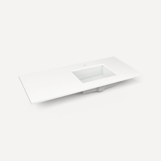 • Our stunning glass top features a rectangular integrated sink, without overflow, in a 19/32" thickness. Our quartz stone tops feature a white rectangular sink, with overflow, in a 3/4" thickness.