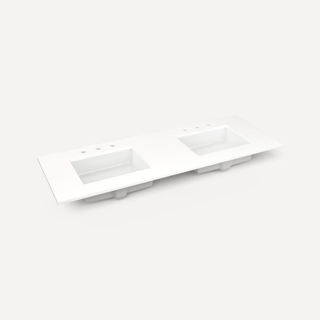 - Our stunning glass top features a rectangular integrated sink, without overflow, in a 19/32" thickness. Our quartz stone tops feature a white rectangular sink, with overflow, in a 3/4" thickness.